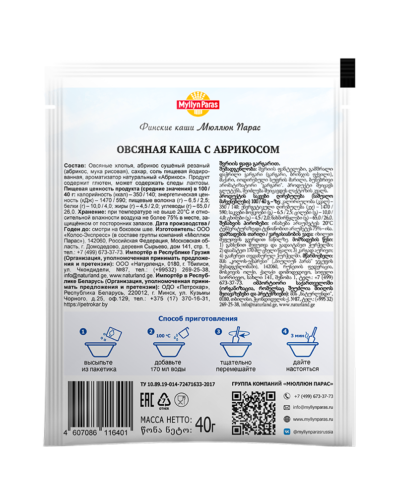 | Состав: | хлопья овсяные; абрикос сушеный резаный (абрикос, мука рисовая); сахар; соль пищевая йодированная; ароматизатор натуральный «Абрикос»; Продукт содержит глютен, может содержать следы лактозы |