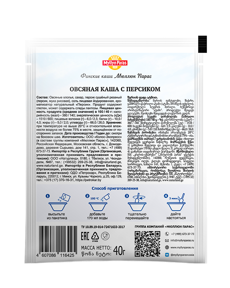Состав: | хлопья овсяные; сахар; персик сушеный резаный (персик, мука рисовая); соль пищевая йодированная; ароматизатор натуральный «Персик»; Продукт содержит глютен, может содержать следы лактозы |