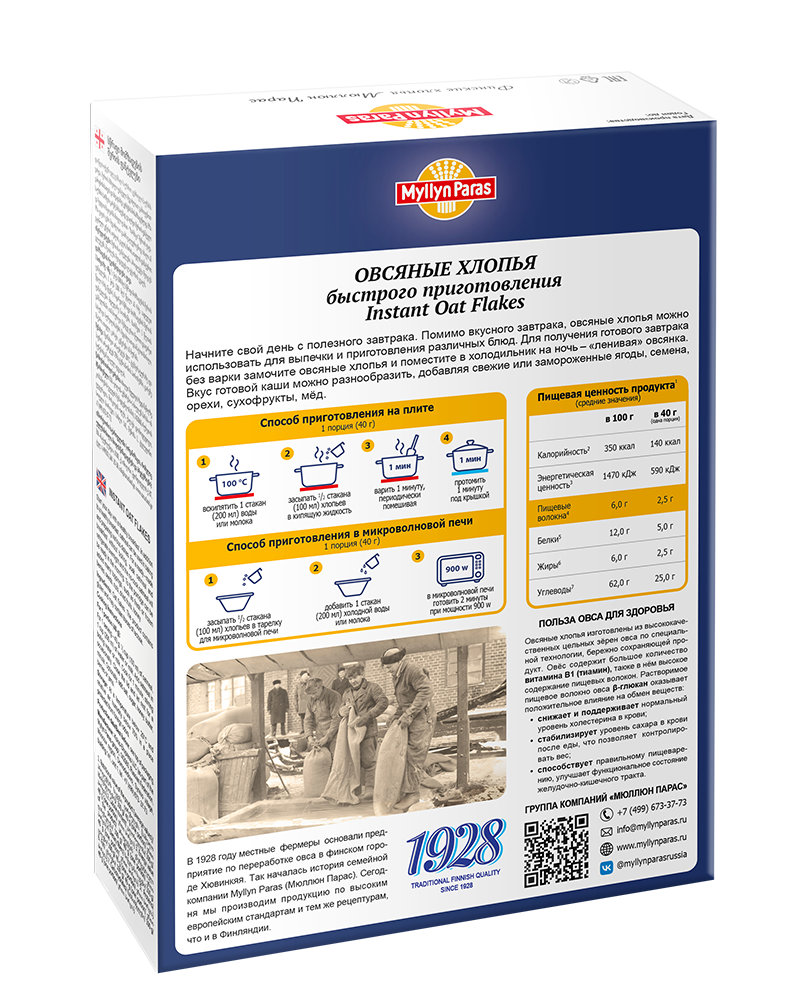 | Способ приготовления: | На 1 порцию – 40г: 2/3 стакана (130 мл) овсяных хлопьев быстрого приготовления, 1 стакан (200 мл) воды, молока или сока. Вскипятить воду (молоко, сок), засыпать овсяные хлопья Myllyn Paras в кипящую жидкость. Варить около 1 минуты, периодически помешивая. |
